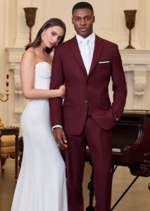 Burgundy / Red Tuxedos & Suits Brunomagli Bruno – This cranberry color dress suit is striking and beautiful. The Super 100’s wool blend is lightweight