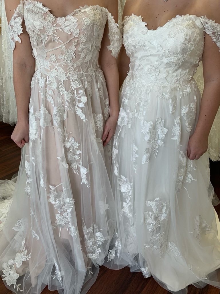If you prefer warm yellow undertones, (avoid if you have cool skin), a dress in latte, mocha, or peach would be the best color choice. The color underneath will highlight the detail of the lace. If you love lace appliqué, or a full lace dress in Chantilly or Venice, the best way to show, the intricate patterns is to add a delicate color like champagne or blush underneath.