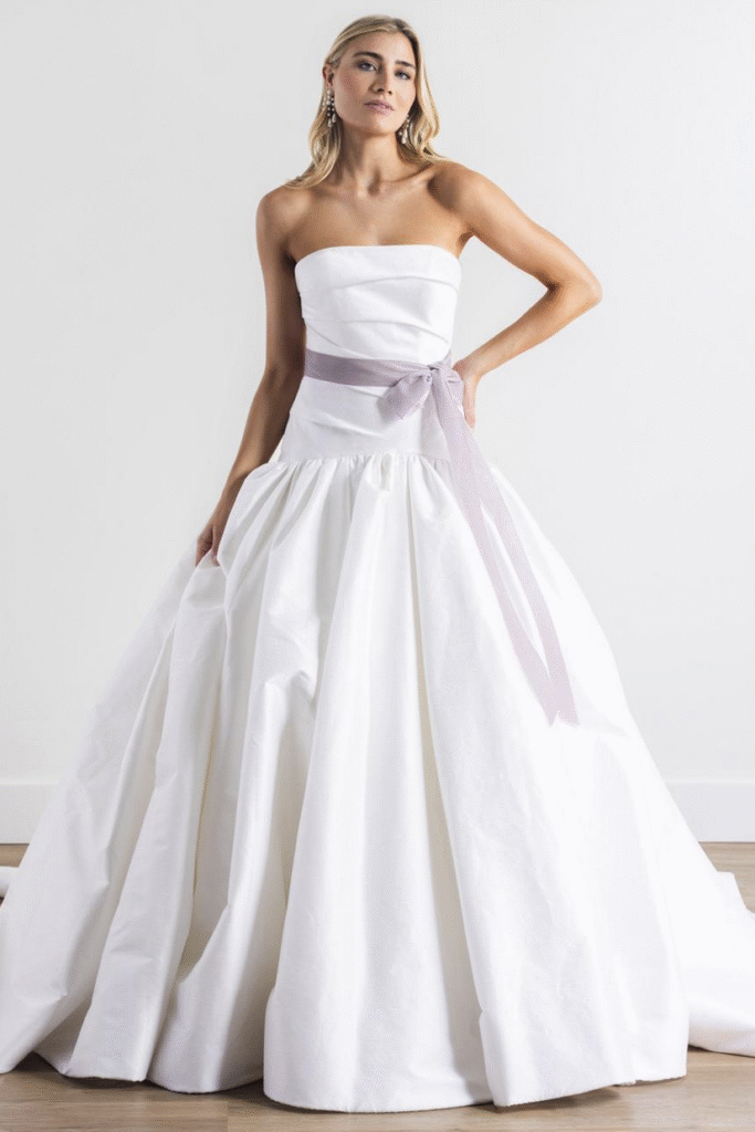 You can have a sash, a thin strip of color at the waist, or a bow that could coordinate perfectly with your wedding colors (flowers, bridesmaid dresses, wedding decor, etc). Wedding gowns with dropped or basque waists look beautiful with a colored sash, like our new Parvati gown from Wtoo by Watters.