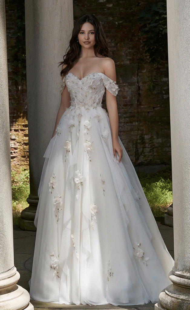 Bridal designers Morilee and Stella York have created simple wedding dresses with fitted bodices full of florals, both embroidered and 3D petals and rosettes.
