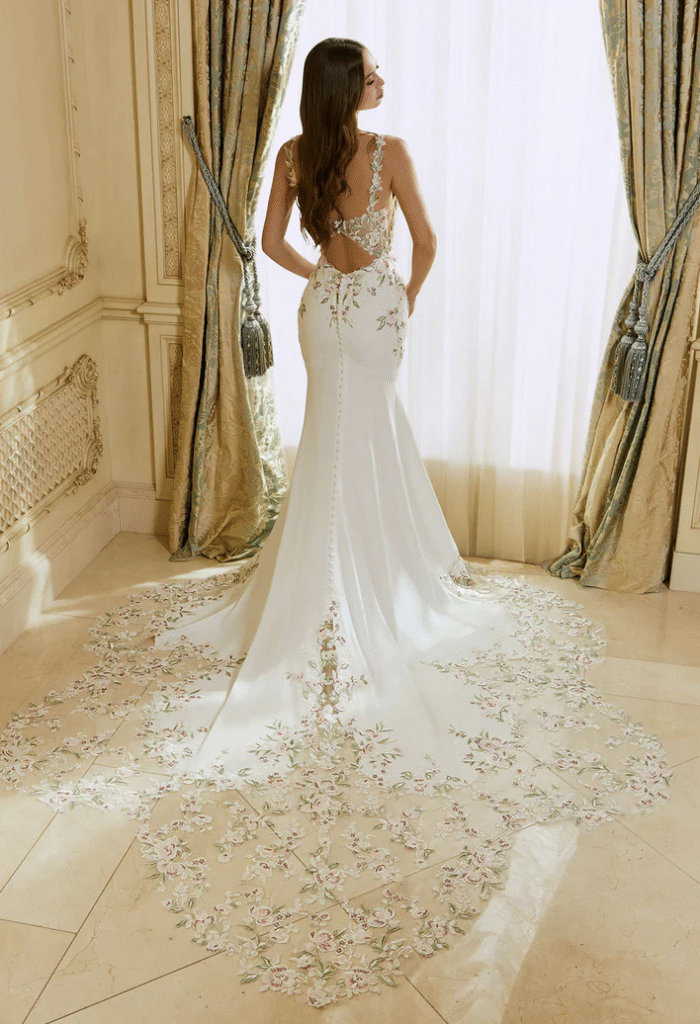 Another great option for our bold brides is Morilee’s Raquel with a bit more vibrant colors on a fitted bodice and cascading down over the hips. The back is a masterpiece featuring more color on the keyhole, and the lace illusion colorful train:
