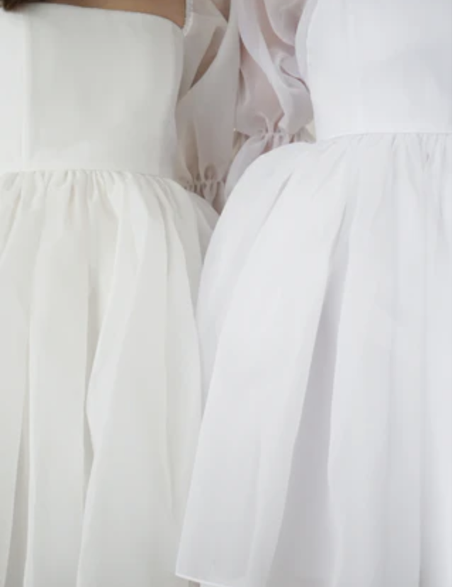Modern brides today are looking at classic style minimalist dresses and often choose a crepe fabric for their dress. Many crepe wedding dresses have a pearl color (often called natural white) with a warmer hue and a softer feel and work well on fair skin.
