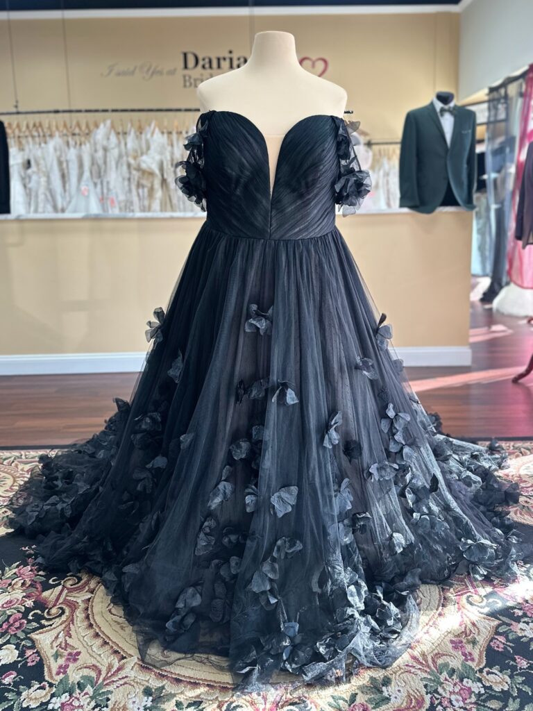 This is another beautiful choice. A layered tulle, v-plunge neckline with beautiful 3D black flower petals, a natural waistline, and off the shoulder sleeves. An elegant look in black with a traditional A-line wedding dress silhouette.