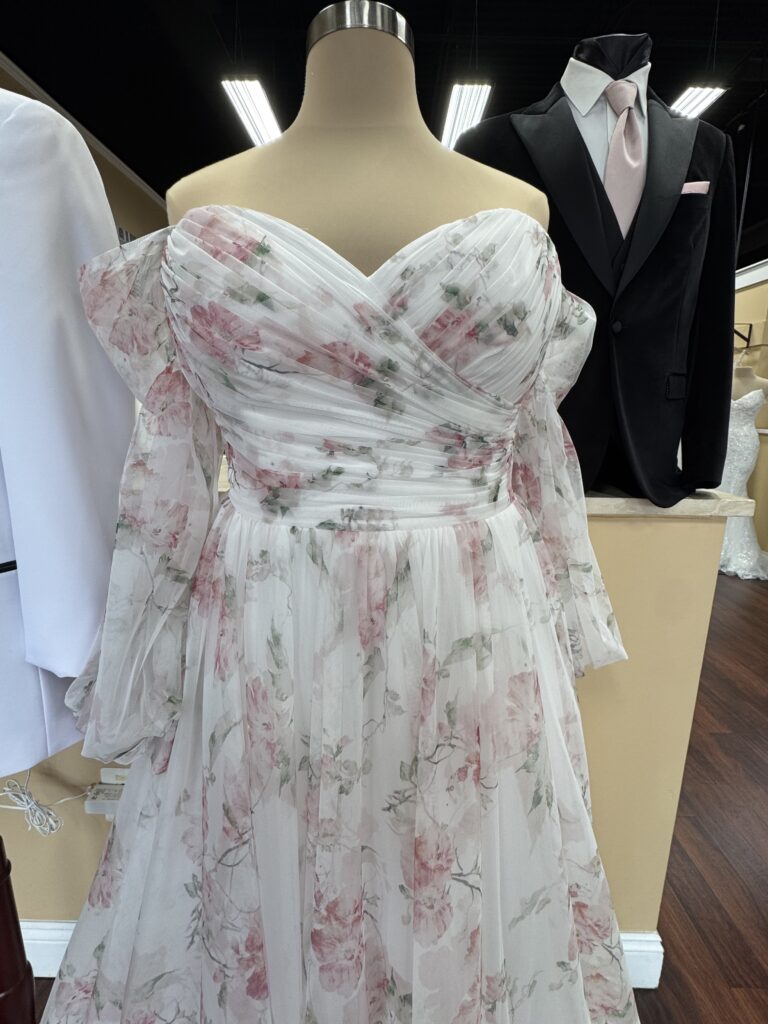 Summary The Latest In Wedding Dress Trends Is Color This bridal trend of color in wedding dresses is more than just a niche idea. The new styles with colorful floral appliqués on corset bodices, embroidered floral embellishments on silk mikado, and dramatic ball gown shapes with bold color and