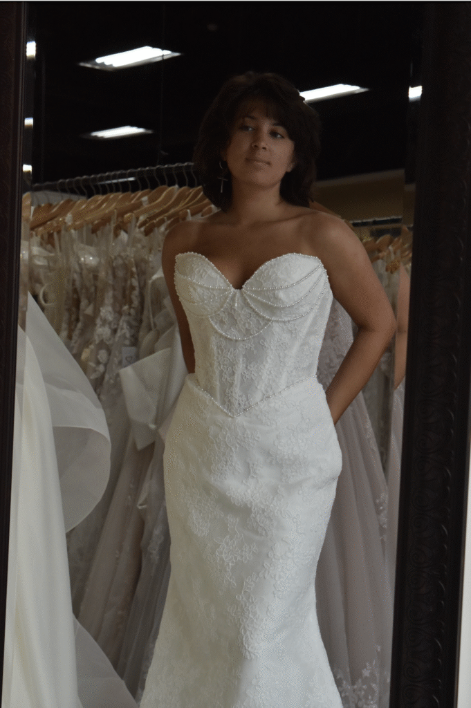 Summary Out of all our new dresses, this one is an absolute stand out. Say hello to Bardot by Evie Young. An absolutely beautiful gown with vintage glam inspiration, pearl drape detailing, trending basque waistline, and a figure-hugging skirt. Get ready to live out that elegant, pearl queen dream on your