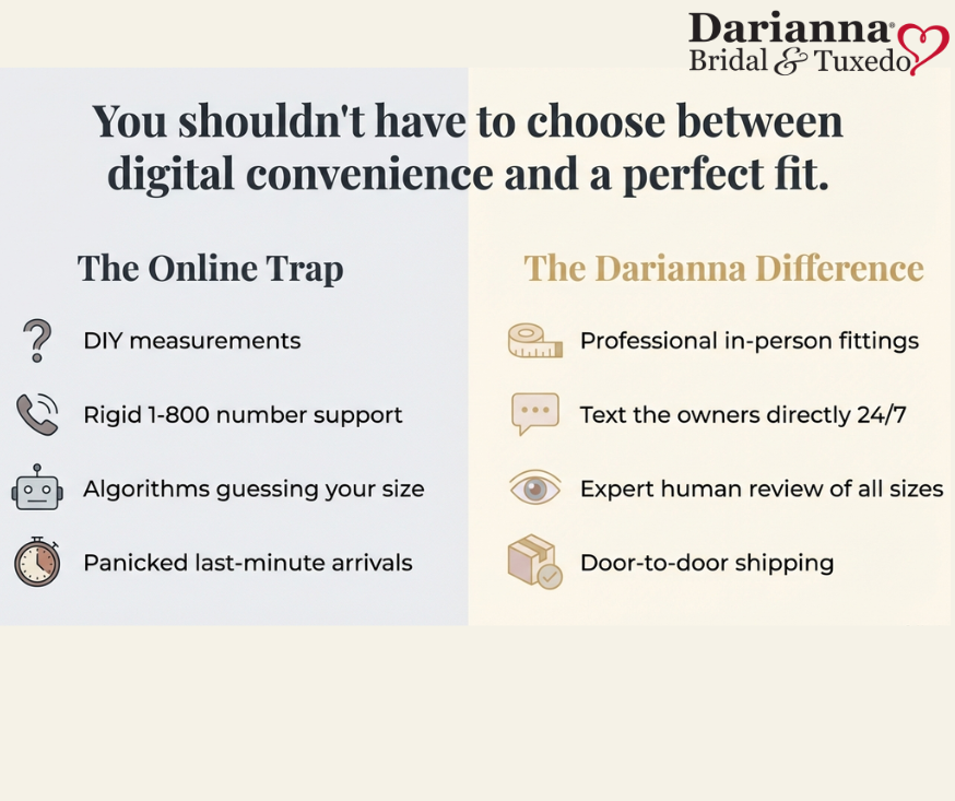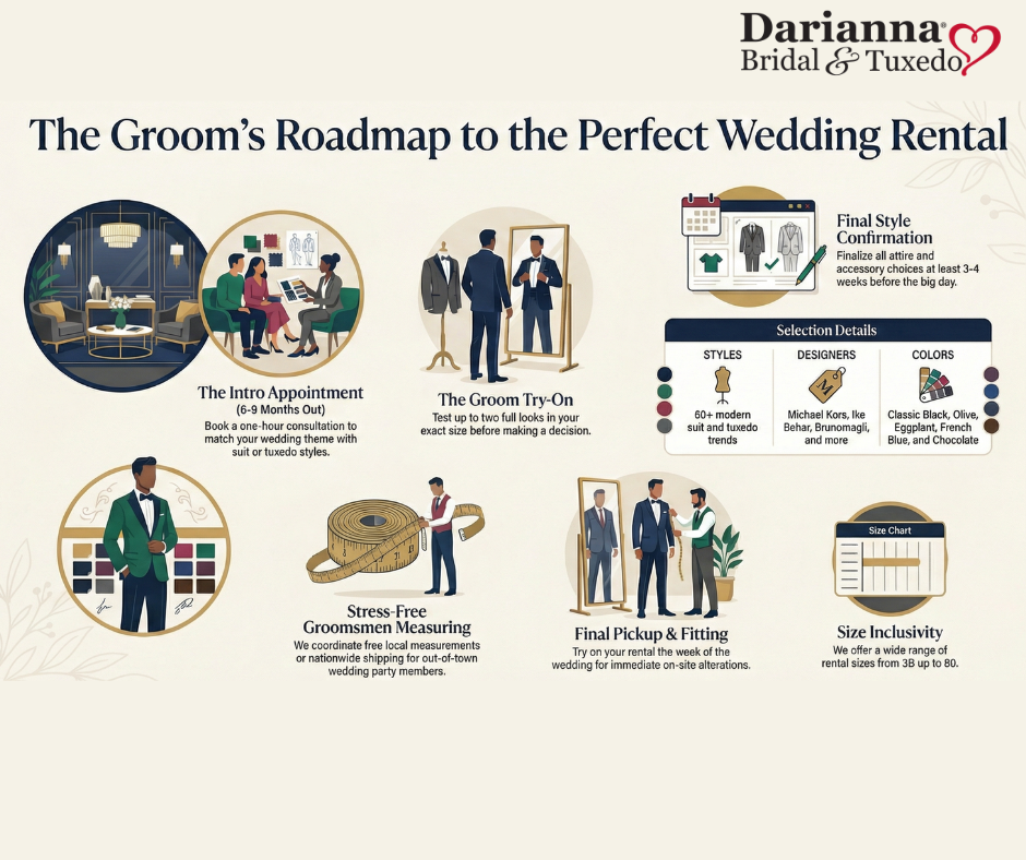 Darianna® Bridal & Tuxedo will arrange to get any out-of-town guests measured near their home or work for free, then submit their measurements to us online. It’s a very convenient service and we can even ship the out-of-town guests the tuxedo or suit rental so he can try it on in advance before the wedding.