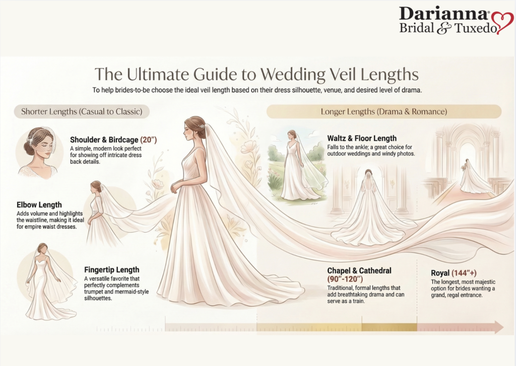 Cathedral and royal veil lengths at Darianna® Bridal & Tuxedo
