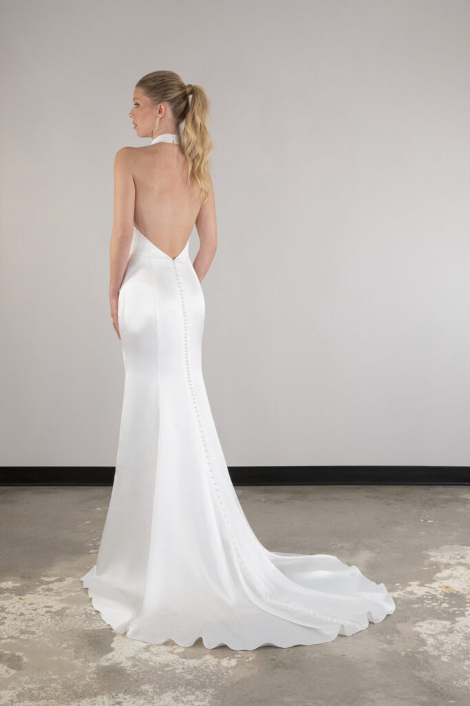 Styles tend to be those more sleek silhouettes like slim A-line or column gowns, and most often do not have elaborate or glittery beading, tiered or layered skirts, and are generally lighter weight. They are the perfect choice for a courthouse wedding, a backyard garden affair, or a modern venue with a small intimate group of wedding guests.