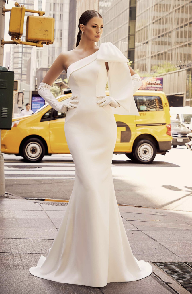 There are other modern column wedding dress options as well. The one shoulder dress is an option to consider! See how the shoulder bow and gloves turn this design into the most elaborate dress while still staying true to a clean, modern aesthetic. Remove the bow and gloves for a minimalist chic look.