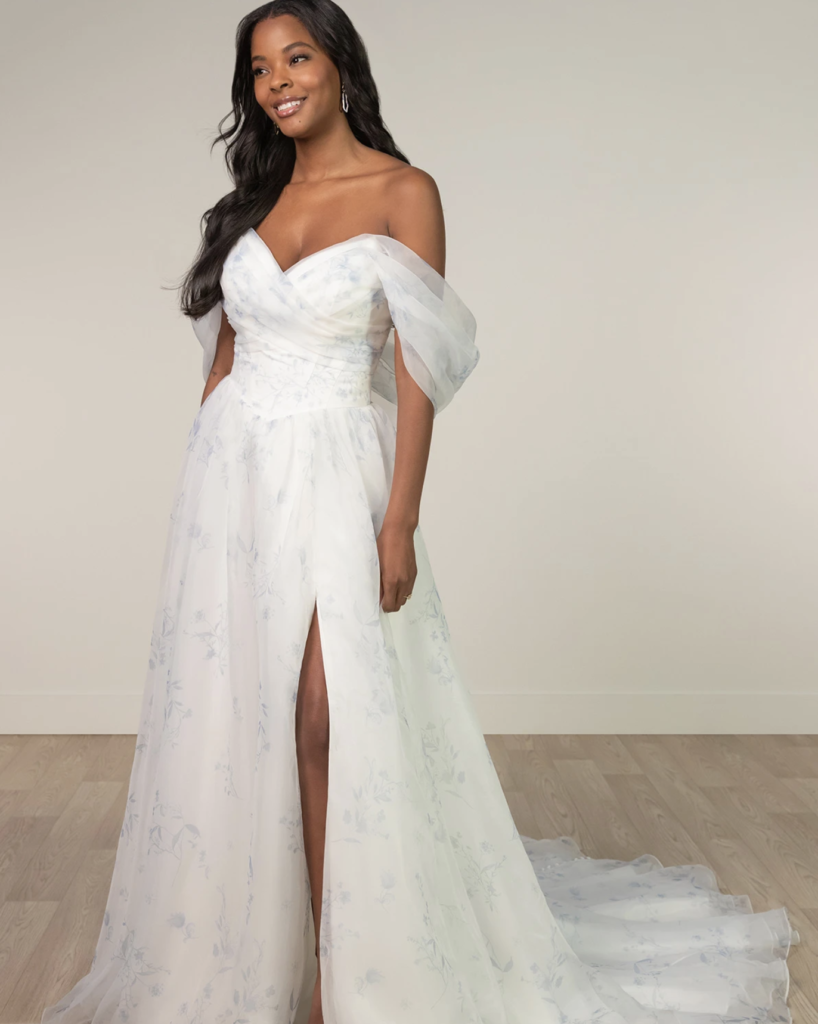 When you have a beautiful and crisp dress in a crepe fabric, it is the most beautiful to add bold florals and bright pops of color. A clean backdrop allows the vibrant colors to add to the beauty and not compete with other dress details (such as lace or beading).