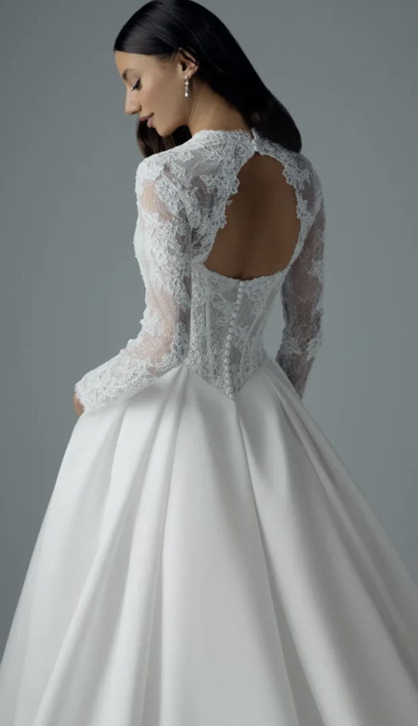 Bree is another new traditional ball gown from Sophia Tolli and fit for royal brides. Gorgeous lace fitted bodice with a Queen Anne neckline and on-trend basque waist. The keyhole back detail with buttons attaches to a satin skirt with box pleating.