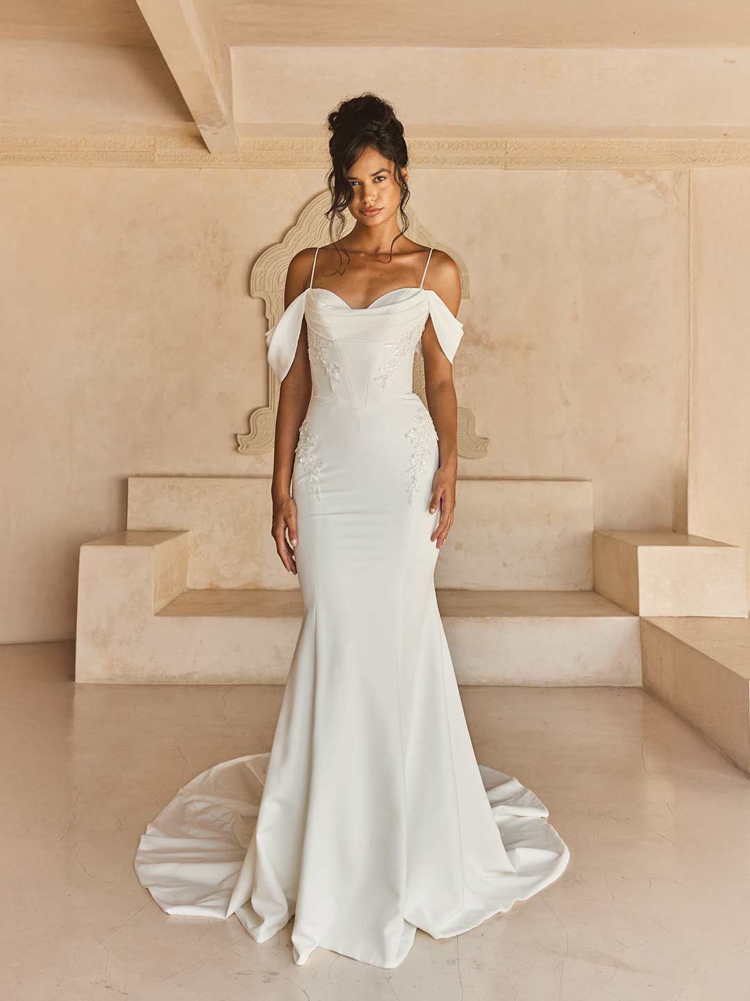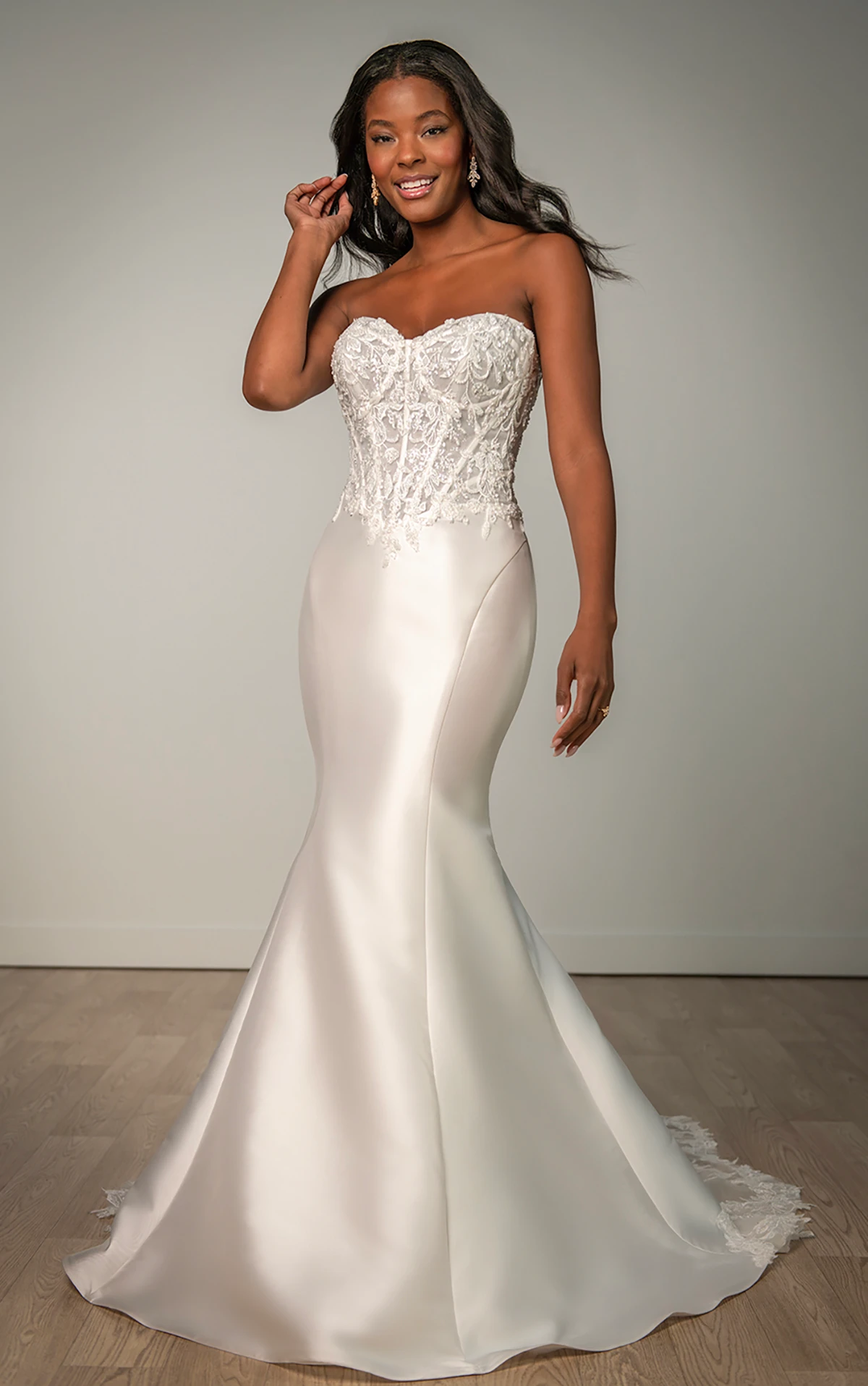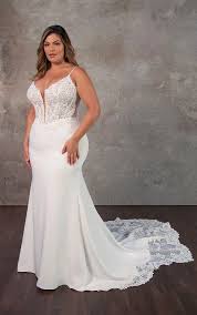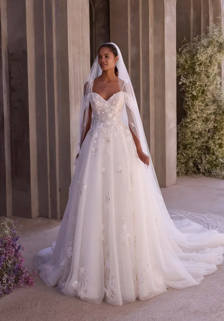 Sizes are listed and know that bridal runs small. Designer size charts are available online (they are all different!) to help determine your size. Dresses can typically be altered down two sizes and made larger by one size, but that is a general guideline. We can give specifics in-store when the dress is on you.