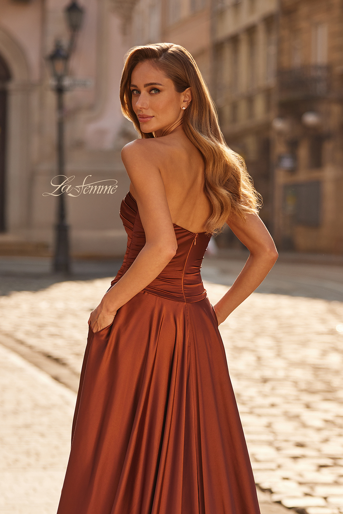 Intricate beaded designs and iridescent stone embellishments are a staple for the La Femme line. Also included are classic and clean gowns that are timeless and ultra-sophisticated. A La Femme dress will make you feel glamorous and beautiful at your special occasion.